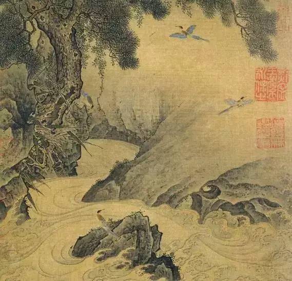 此图绘参天的古松下,山溪迂回奔流,水花飞溅,四对山鹊姿态折柳,或飞呜,或回旋,或啄食与山涧和树石之上,形象无邪。图顶用浓墨画松斡和松鳞,松针用墨线勾描后用石青渲染。竹叶用严谨的双钩填色法。山石则用墨线勾画空洞,进而用淡青色破染,使画面豪阔立体感。此图用笔遒劲,静中有劲,为南宋小幅花乌画中精秀之作。这幅作品依然明黔宁王沐琳和项元汴储藏。