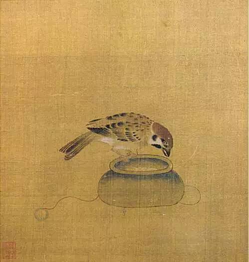 一只麻雀站在浅蓝色的敞口瓷罐上,瓷罐内有白米,麻雀雀不食,却俯首啄罐沿。《驯禽俯啄图》以极其节约的构图和精细的笔触,诠释着一个蕴含深意的故事。