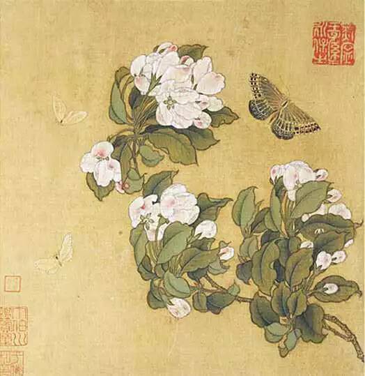 在蜂、蝶的塑造上,勾画与渲染打成一派,先以极细而淡的线条勾画空洞,然后再“随类赋彩”,或以粉白、土黄多层积色,或在墨线中填重彩,晕染工细而光辉丰富,展现出蛱蝶翅翼的秀美之好意思!