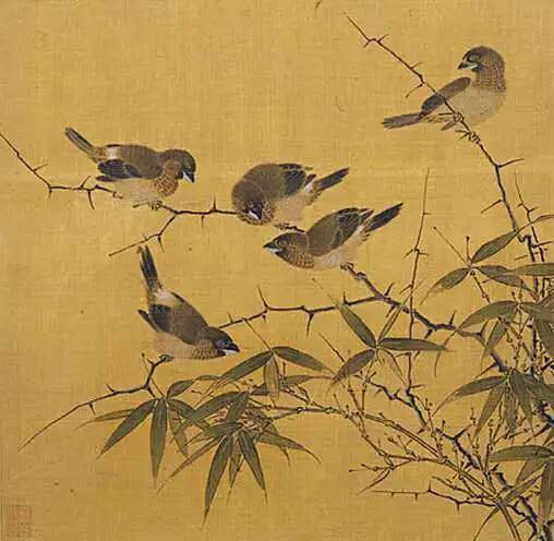 《霜篠寒雏图页》里5只文鸟集于枯棘上,姿势折柳,神色如生。枯棘下的竹枝色黄叶疏,点明了瑟瑟秋意。文鸟的描摹先勾出空洞,再用细劲的笔锋绘出羽毛,并施以淡墨、赭石等色,渲染出毛绒的质感;竹叶使用双钩笔法,然后渲染;竹竿选拔白描法;险阻则一笔画出,显得遒劲老到。