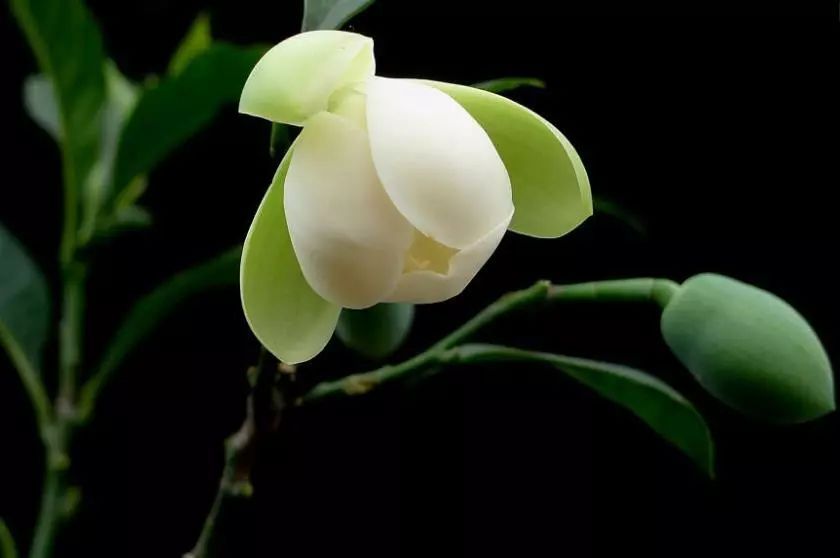 《夜合花图页》中,夜合花一根两枝,右枝花朵黄花少年,左枝花朵半开半合,白皙如玉,清雅绝尘。花朵轻勾淡染,用白粉点画花蕊,花叶先以细笔勾画空洞和筋脉,后用汁绿与花青染之。绿叶穿插向背,档次安排奥密,画面节约而不只薄。