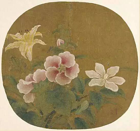 此图施展暖风薰醉,群芳争艳,馥郁的花香似从画面中扑鼻而来。锦葵红艳,栀子白皙,百合娇黄。画家不仅工致入微地刻画出花瓣的丝丝纹理和叶片的缕缕筋脉,而况在设色上也致力于逼真贴切,锦葵用白粉勾染花朵,并着曙红色由花心向外渐次晕染,丰富的色调变化增强了画面的档次感,同期也渲染出鲜花的人命活力。叶片着色虽较轻盈,然用水晕的要害施展出绿色的浅深幻化,自满出夏季的无限渴望,也衬托出群芳的明媚娇艳。
