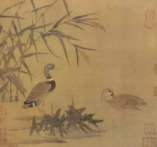 图绘溪边芦苇、茨菰丛生,枝繁叶茂,勃勃渴望。雄鸭在岸边单足耸峙小憩;雌鸭于水中总结梳羽,姿态闲逸,气度雍容。此图意在施展一种祥和放心的烦恼,应是南宋画院点缀升平之作。构图闇练简练,画面左中部为芦苇所荫蔽,给东说念主安全之感;右上方则留出一派水面,启东说念主遐念念,以免顽固。敷色精细写实,雄鸭毛羽的施展尤见功力。今色调虽已暗旧,尚可想见以前斑斓生辉之状。